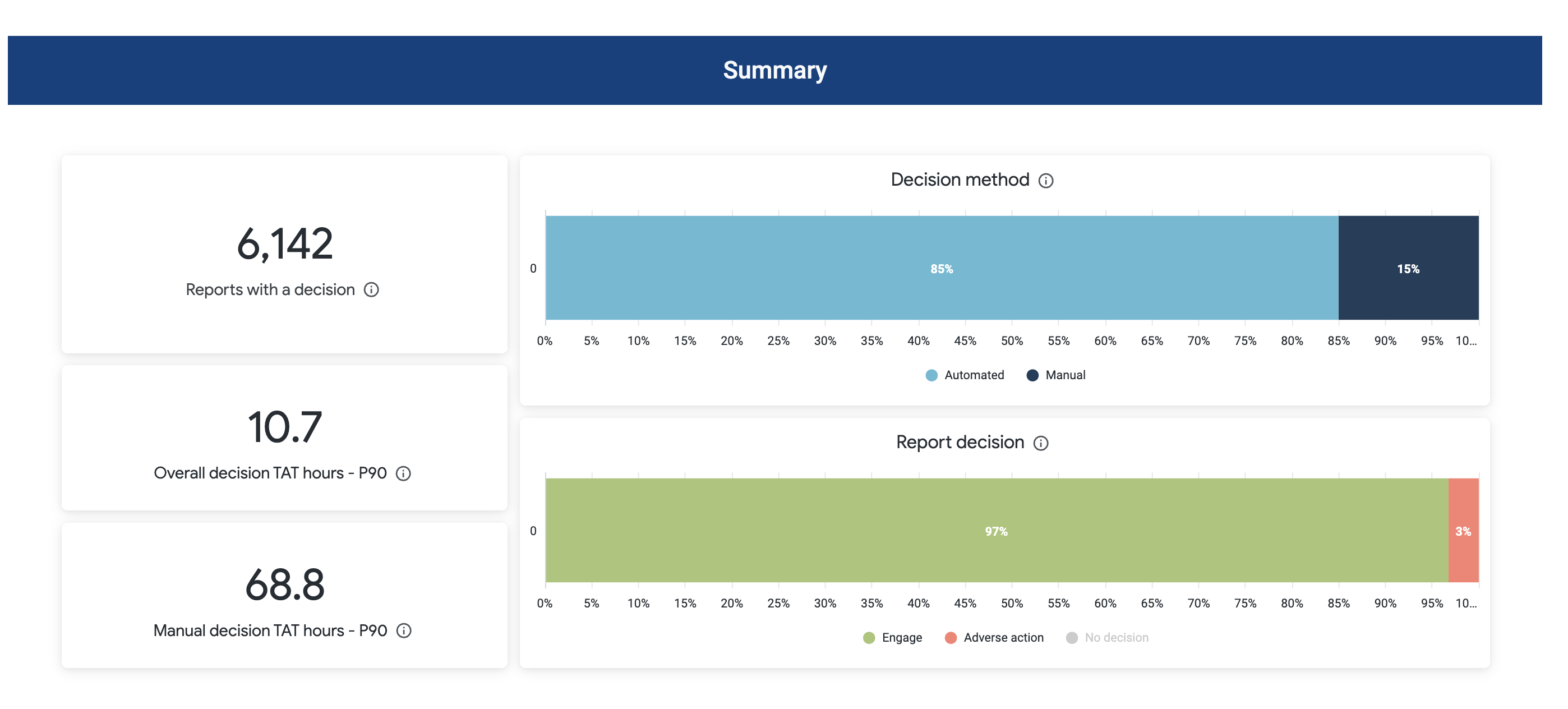 Team Performance – Analyze your team's manual adjudication efficiency with detailed performance metrics including turnaround times and individual adjudicator breakdowns. Toggle between different views to focus on specific decision types.
